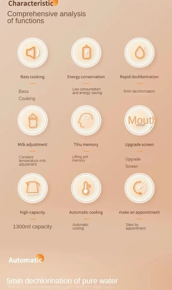 Crafted from high-quality, food-grade materials, the kettle ensures safety, purity, and long-lasting durability. Its 360° rotatable base and sleek design make it both functional and elegant — a perfect addition to any nursery or kitchen.