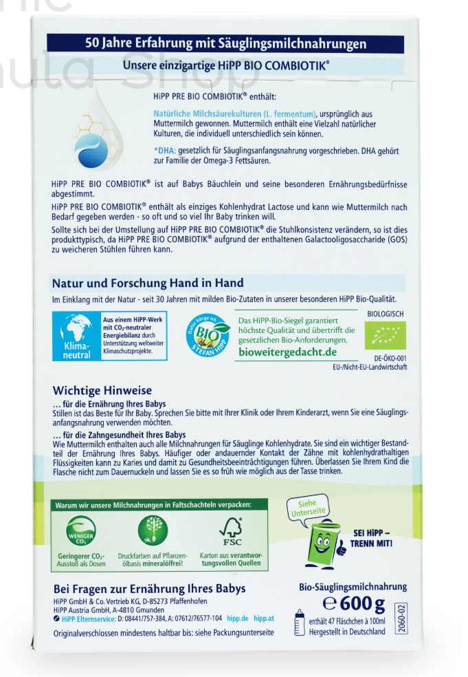 HiPP Bio Combiotik Stage 1 contains prebiotics and probiotics to promote healthy digestion, along with Vitamins A, C & D, Iron, Iodine, Calcium, and Omega-3 (DHA) for complete nutritional support.